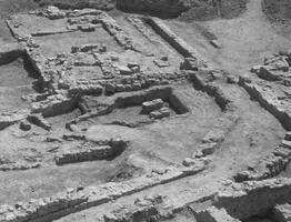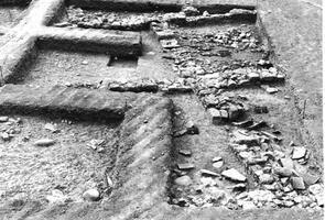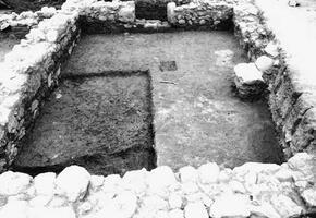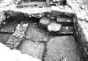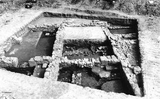 Nine trenches (3x3 m.) were opened and were later unified in one. Seven rooms were detected, from which rooms 3 and 4 were excavated completely (Fig. 4), and the remaining ones were partially investigated. An extended destruction layer of roof tiles and building material was found in the deposits of all rooms (Fig. 5). Under the foundation layer of the floors, older walls were also discovered, however these were not fully investigated due to the presence of groundwater (Fig. 6). These walls date to the Roman period, based on the abundance of Late Roman pottery which was found in the foundation of the Early Christian floors. Six complete vessels were discovered inside the rooms (a bowl, a jug, three amphora, a plate, a flask (Fig. 7) as well as a marble pillar 0.75 m. high (Fig. 8), potentially for table support, decorated with an ivy wreath at one side. A bronze miniature male bust was also collected along with glass fragments from pedestalled conical cups, 23 bronze coins and objects for everyday use.