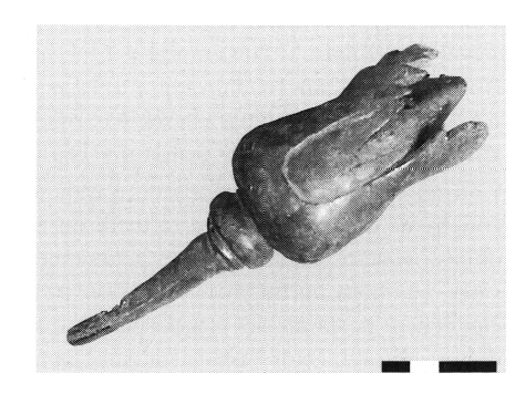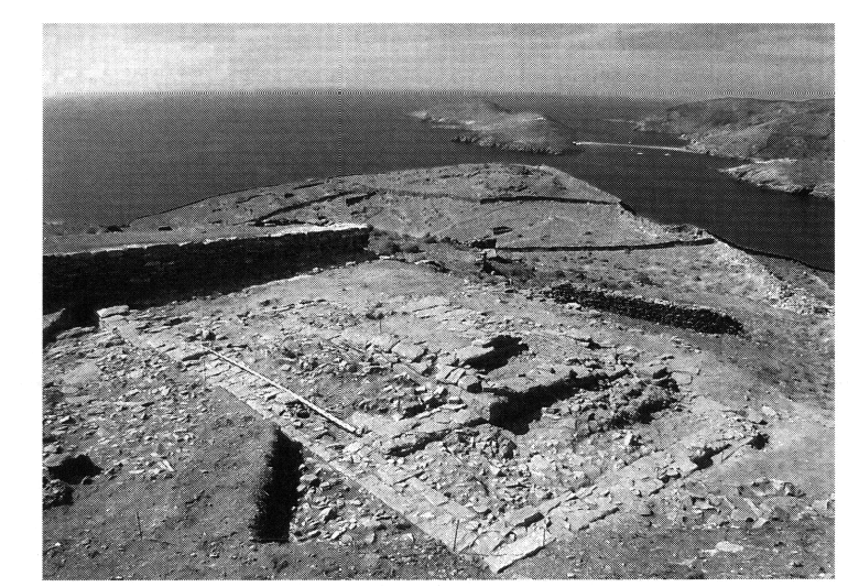 La fouille a effectivement mis au jour un temple d'époque archaïque, orienté vers l'Ouest (fig. 1), fondé sur une terrasse retenue par un puissant mur de soutènement. L'édifice comporte un petit adyton (2 x 3 m) et une cella (3 x 5 m), la disparition de la partie antérieure du monument ne permettant pas de savoir s'il était pourvu d'un pronaos. Le mur qui sépare la cella de l'adyton est assez mince (0,25 m) et son ouverture possède un seuil monolithique en place. Le monument est entouré par une fondation qui n'est pas conservée sur les côtés Nord et Ouest, mais dont les dimensions extérieures sont estimées à 14,65 x 8,65 m. Sa technique architecturale et l'absence de tout fragment de colonne ne plaident pas en faveur d'un édifice péristyle, à moins de supposer une colonnade et un entablement en bois. Certains indices suggèrent d'autre part que cette fondation est un ajout ultérieur et qu'elle devait servir de péribole. Si l'on en juge par les nombreuses tuiles, trouvées surtout dans l'adyton, le temple était couvert d'un toit à tuiles corinthiennes. Les murs étaient construits entièrement en schiste (gros blocs à l'extérieur, moellons à l'intérieur). Leur légère inclinaison et l'absence de traces de feu font penser que l'édifice fut détruit par un tremblement de terre.