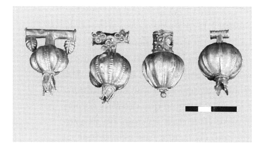Parmi les trouvailles on retiendra : environ 70 objets en or (pendentifs de formes diverses [fig. 2], perles, rosettes, doubles haches, bijoux, deux fragments d'une plaque décorée au repoussé d'une file de chariots) ; près de 120 objets en argent du même type ; environ 450 objets en bronze (nombreux bijoux, une phiale à omphalos, un bouclier miniature et une fleur de lotus avec sa tige sans doute destinée à être insérée dans une statue ou dans un sceptre [fig. 3]) ; une centaine d'objets en fer (fibules, clous) ; environ 300 bijoux et autres petits objets en os (fibules de type italique, doubles haches, perles, plaquettes) ; de nombreux bijoux et perles en cornaline, cristal de roche, pâte de verre, faïence et pierres semi-précieuses, dont certains portant des représentations en relief (griffon, sphinx, cervidé ou chèvre, oiseau) ; une perle amygdaloïde talismanique de facture minoenne avec scène de bateau ; plusieurs scarabées égyptiens (XXIIe et XXVIe dynasties) et insulaires ; enfin divers orientalia (sceaux, disques à décor en relief, têtes de figures humaines, perles de verre phéniciennes).