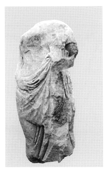 — En 2002 a été achevé le relevé topographique de la muraille Nord. D'autre part, au Sud de la ville antique, on a trouvé un intéressant relief fragmentaire (fig. 3) remployé dans un mur de terrasse moderne. Œuvre de belle facture de la fin du IVe s. av. J.-C., il représente un personnage masculin vêtu de l'himation qui pourrait être un dieu ou un héros, peut-être Asclépios, Amphiaraos ou Dionysos.