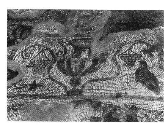 – deux pièces d'une maison paléochrétienne, dont le sol était pavé de mosaïques (terrain Kouzouka-Zoï, au Sud du terrain Donlou, v. BCH 123 [1999] Chron., p. 804). La mosaïque la mieux conservée comporte un cadre à trois zones (rinceau, poissons, triangles) entourant un tapis central séparé en quatre compartiments ; l'un d'entre eux est décoré d'un canthare d'où s'échappent des pampres, avec des perdrix sous chaque grappe de raisin (fig. 1).