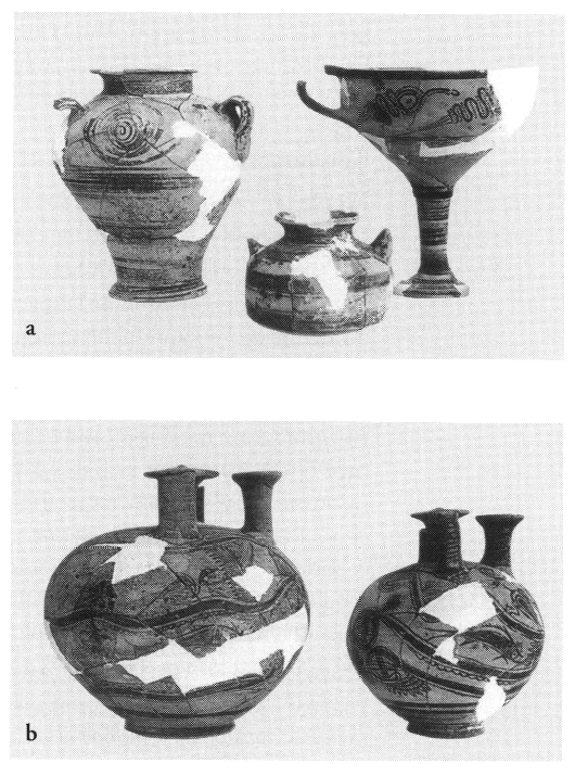 Tombes et nécropoles. Une tombe à tholos mycénienne construite en plaques de pierre blanche a été découverte au km 3 de la route communale Kos-campagne (terrain Georgara) dans une zone où l'on connaissait déjà l'existence de tombes hellénistiques et d'une tombe à chambre mycénienne. La chambre de la tholos mesure 4,14 m de diamètre et sa hauteur conservée est de 2,10 m. Sur le sol de la chambre et dans une fosse creusée au centre, on a recueilli un riche mobilier : ornements de vêtement en or en forme de rosace, perles de bracelet en forme de papyrus, pointes de flèche en bronze, poignard en bronze, etc. ; trente-neuf vases de types divers ont été restaurés (amphores, coupes, alabastres, cratères), parmi lesquels dominent les amphores à étrier et les pithamphores (fig. 2a-b). La découverte de cette tombe (brièvement mentionnée dans BCH 122 [1998] Chron., p. 938) est exceptionnelle pour le Dodécanèse, où les tholoi sont particulièrement rares.