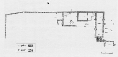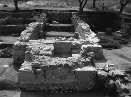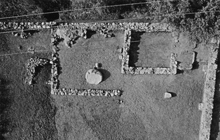 - l’installation byzantine. – Il s’agit d’un complexe de 300 m2, constitué de pièces disposées en deux ailes et une grande cour délimitée par un mur de pierres (fig. 2). À part quelques vestiges de murs, l'aile Nord est très mal conservée. Les vestiges de l'aile Sud, mieux conservés, ont permis de distinguer deux phases de construction ; la première, datant de l’époque protobyzantine d’après le mode de construction, est constitué d’un édifice rectangulaire tripartite ; la deuxième, datant du XIIe s., correspond à l’ajout de pièces à l’Ouest et au Nord ainsi qu’à l’aménagement de la cour. – On a identifié dans l’aile Ouest un pressoir à vin, constitué d’une aire de foulage et d’une cuve construite en contrebas (fig. 3). Le sol de l’aire de foulage est incliné (pente de 10%) vers un orifice permettant l’écoulement du moût vers la cuve, construite à un niveau inférieur et qui elle-même possède une canalisation permettant la récupération du liquide dans des récipients. Au Nord et au Nord-Ouest de l’aire de foulage, on a identifié une série de pièces, dont les vestiges, sans aménagement particulier, ne permettent pas de déterminer la fonction, qui devait être néanmoins liée à la production du vin. L’aile Sud du complexe est constituée de quatre pièces et d’un portique (fig. 4). Dans l’une des pièces, on a reconnu les vestiges de deux cuves peu profondes, auxquelles est sans doute lié un amas de chaux découvert dans un angle. Une meule était encore en place dans une autre pièce (fig. 5). Les bords relevés sur la surface de celle-ci attestent sans doute un usage premier, peut-être un pressoir mobile associé à un récipient. Dans la même pièce, deux structures en forme de cuve et un autre amas de chaux dans une structure peu élevée permettent d’identifier les vestiges d’une tannerie (peut-être pour la fabrication d’outres en cuir pour transporter le vin ?). Ce type de pressoir bâti est connu aux XIe-XIIe s., surtout dans des ensembles monastiques (au Mont Athos par exemple).
