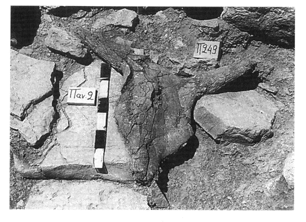 2) Mégaron Δ. Dans la pièce centrale de ce bâtiment (Δ2), la fouille a atteint aussi la couche minoenne (MM). C'est là qu'a été faite la découverte la plus intéressante : un crâne de taureau coupé verticalement dans sa partie arrière et percé d'un trou entre les deux cornes (fig. 1). L'objet a été découvert sur une construction en pierre (mur ?) repérée sous le seuil de la porte Ouest de la pièce daté du GA ; contre le crâne se trouvaient une meule circulaire en pierre, une petite molette ellipsoïdale en pierre aussi, plusieurs graines carbonisées et des fragments de tasses ; on note, enfin, la présence d'un grand nombre d'ossements et de cornes associés au même contexte.