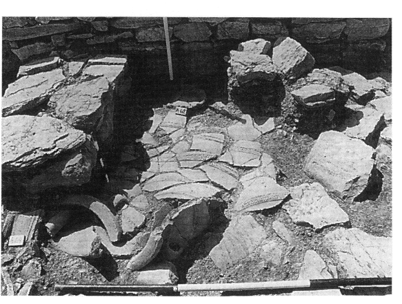 La fouille dans l'opisthodome de ce même complexe (Δ3) a donné des informations strati-graphiques intéressantes : deux états du seuil de la porte Ouest, datant du GA et du GR ; dans la partie Nord-Ouest de la pièce, un dallage du GA et, dans la partie Sud-Ouest, une construction du GR (deux assises de dalles) correspondant à une sorte de trapéza ; juste au Nord et en partie sous cette construction, un grand pithos décoré de bandes en relief incisées (fig. 2) et une petite pyxide qui doit dater de la période subminoenne.