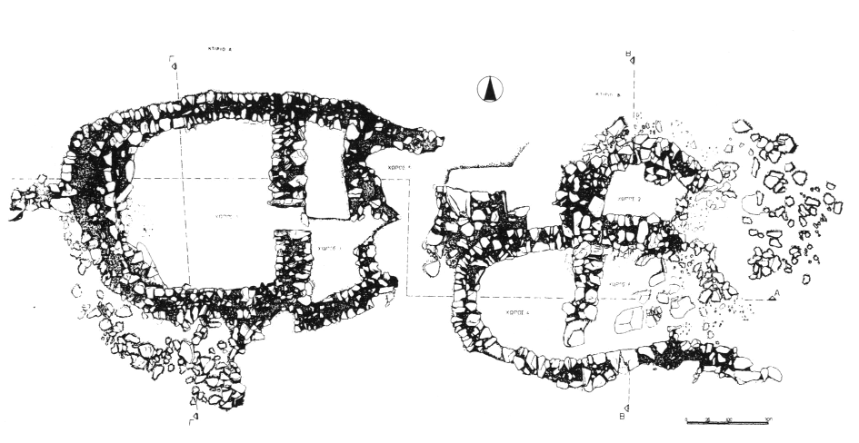 Deux constructions minoennes en fer à cheval ont été repérées, en 1996, au lieu-dit Kokkinochoma, sur le versant Sud du Psiloritis, à 3 km environ au Nord du village. La fouille a montré que les deux bâtiments, A et Β (fig. 1), étaient constitués chacun d'une grande pièce absidale précédée d'un vestibule. Contre le bâtiment Β a été mise au jour une petite pièce également absidale ; à l'intérieur de l'abside du bâtiment A, une banquette construite. Ces constructions, qui n'avaient aucun caractère funéraire, ont livré très peu de mobilier : quelques tessons de vases domestiques (chaudrons, pithoi) et de tasses non décorées, qui datent du MM IA au MM III. L'environnement montagneux et la forme des constructions suggèrent que l'on a affaire à des installations pastorales.