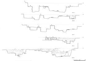 Twelve trenches, 3×3 m. were excavated in total, bringing to light fragmented walls and finds that do not comprise well-defined spaces (Fig. 1,2,3). The most characteristic architectural structure is an elongated wall, extending all along the plot with a W-E orientation. This wall defines successive deposits of pottery and building material that extend towards the N and are sealed with four successive earthen floors. It is possible that this structure was part of a road, a hypothesis supported by the discovery of the destroyed wall 4, which was potentially the north retaining wall of the road, parallel to wall 1.