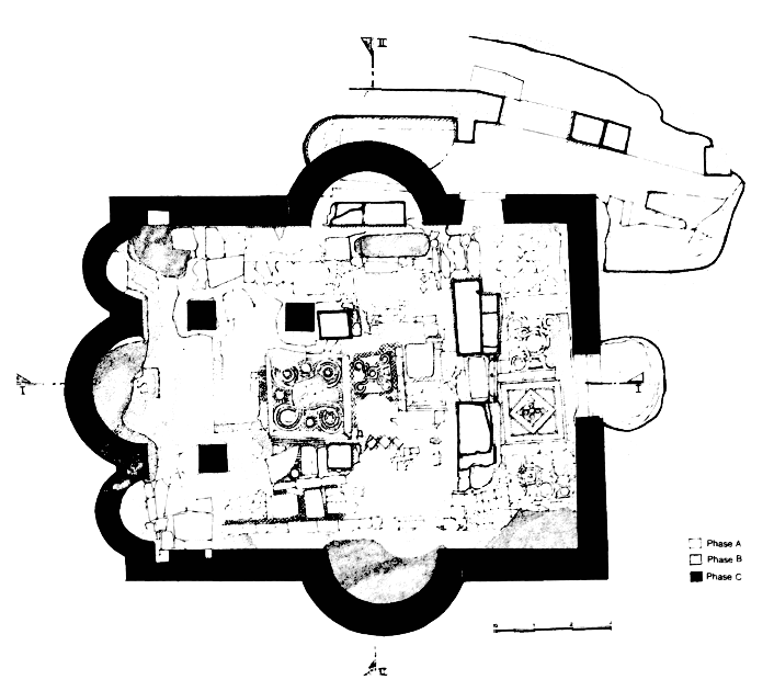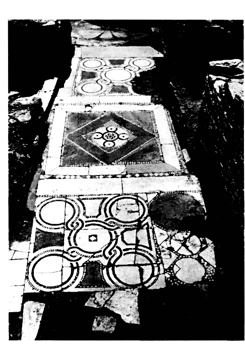De la première église, en croix inscrite et dont les dimensions n'ont pu encore être estimées, subsistent des fondations de murs et de l'autel de plan orthogonal, les restes de quatre piliers et surtout des pavements de marbre polychromes mésobyzantins (sans doute des XIe-XIIe s.) de grande qualité, dont la disposition atteste l'existence d'un narthex (fig. 66) ; les deux nefs latérales étaient pavées de dalles de marbre de tailles et de couleurs différentes.