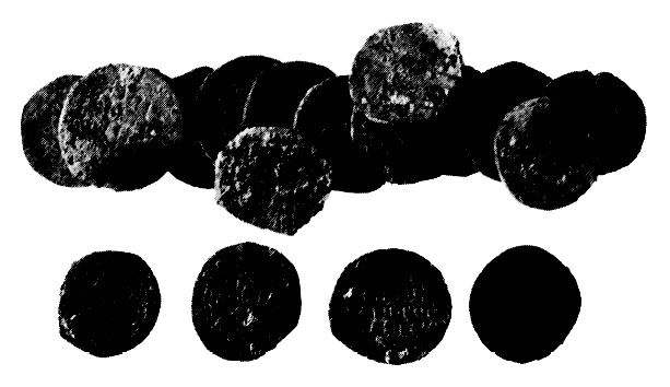 1) Angle Nord-Ouest. — Les investigations conduites dans la partie Nord du secteur se sont concentrées sur les niveaux byzantins recoupés l’année précédente (v. ibid). Dans la zone délimitée par l’étroite rue Nord-Sud et une ruelle perpendiculaire, on a exploré trois maisons dont plusieurs pièces avaient déjà été fouillées en 1991 et 1992 (v. BCH 116 [1992] Chron., p. 836 ; 117 [1993] Chron., p. 767). On souligne la densité des constructions et le nombre impressionnant de pithoi et de silos à l’intérieur de celles-ci. Après deux siècles d’abandon, le secteur fut réoccupé. Vingt et une monnaies de bronze — « follis anonymes » portant le buste du Christ au droit, l’inscription « Jésus-Christ roi des rois » sur 4 lignes au revers (fig. 1) — frappées entre 970 et 1059 confirment que la principale phase d’occupation du quartier date du XIe s.