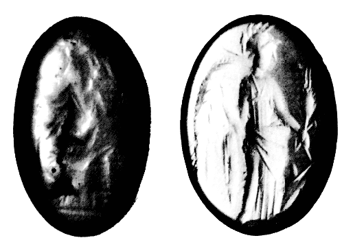 Parmi les remplois utilisés dans la construction des murs, on mentionne la partie supérieure d’un pilier hermaïque en marbre portant une invocation à la Bonne Fortune ; parmi les trouvailles (dans les couches supérieures de la ruelle Est-Ouest), deux gemmes romaines représentant l’une Athéna, l’autre Fortuna (fig. 2).