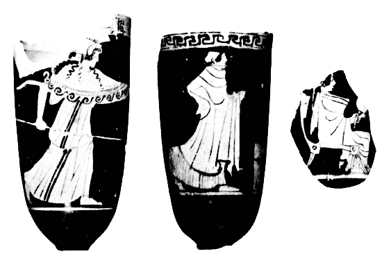 À l’arrière du bâtiment commercial classique, la fouille d’un puits a livré des fragments de céramique à vernis noir, d’amphores et de récipients culinaires (2e-3e quarts du Ve s. av. J.-C.) ainsi que quelques vases à décor figuré : une coupe à figures noires (frise de personnages debout et assis) et trois lécythes à figures rouges (décorés respectivement d’une Athéna, d’une femme à l’autel et d’une femme assise se regardant dans un miroir (fig. 3). La présence de pierres polies aussi bien dans le remplissage du puits que dans les niveaux inférieurs du bâtiment suggère une relation possible entre ces deux structures.