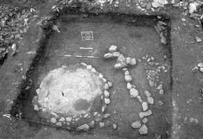 - au Nord de cet ensemble, a été dégagée une grande structure circulaire de 2,20 m de diamètre avec un sol en argile d’environ 1,25 m de diamètre, entouré de deux murs parallèles et sans doute couvert par une voûte. Il s’agit probablement d’un four (fig. 2).