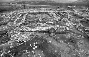 - immédiatement au Nord, a été fouillée une grande maison rectangulaire construite en moellons et en terre (fig. 3). Dans la maison ont été identifiés des fragments de sols, trois foyers et deux vases de stockage (fig. 4). On distingue plusieurs phases d’occupation et des réaménagements du plan. Cet espace construit se développe autour du noyau de l’habitat, qui est lui-même entouré de murs de péribole. Au moins deux de ces murs ont été dégagés : ils sont construits en terre et en moellons et présentent une inclinaison vers l’intérieur. À l’intérieur de ce dernier péribole, se trouve un édifice central de 8,40 x 10,20 m. Ses murs sont construits en terre et en moellons et l’espace intérieur est rempli de moellons.