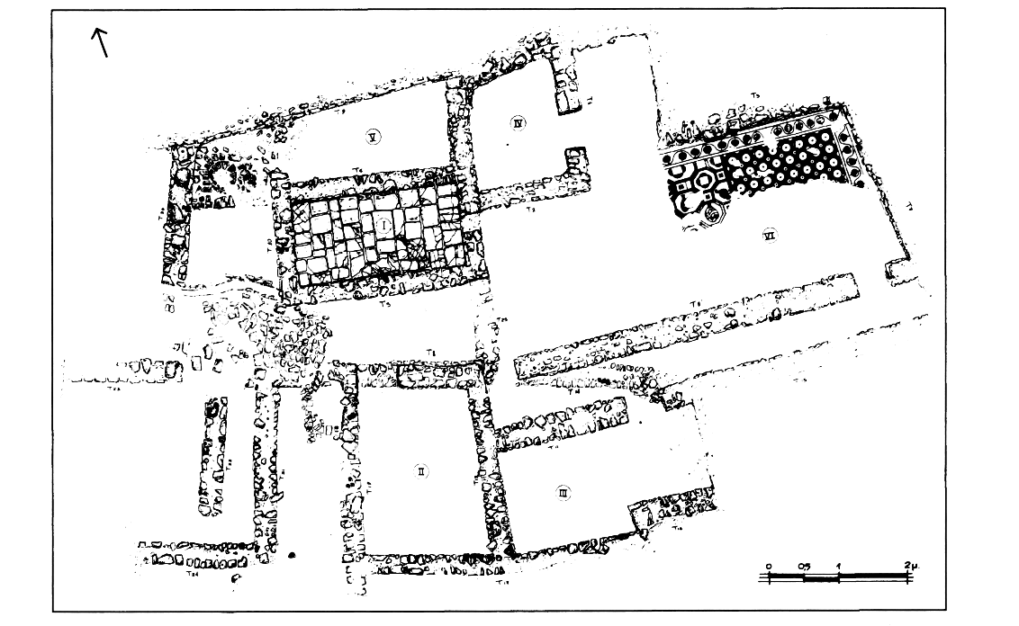 Dans le premier terrain, on a dégagé, au bord d'une rue dallée qui reliait une route côtière à l'arrière-pays, une maison occupée du début du IIe s. av. J.-C. au début du VIe s. ap. J.-C. (fig. 103). L'état initial comprenait cinq pièces, dont une cuisine et un cubiculum, auxquelles fut ajouté plus tard (Ier-IIIe s. ap. J.-C.) un atrium pavé de mosaïque (deux panneaux, l'un orné de motifs géométriques, l'autre d'oiseaux et de poissons inscrits dans des octogones bordés de bandes à motifs végétaux) ; dans le dernier état (lVe-VIe s.), l'atrium fut raccourci par l'aménagement d'un corridor. De l'autre côté de la rue, la fouille a notamment mis au jour un foyer en briques et une citerne (?) sur le sol dallé de laquelle gisait une colonne cannelée. Parmi les trouvailles, outre une abondante céramique domestique et de stockage, on mentionne un sceau en argile décoré d'une croix gravée.