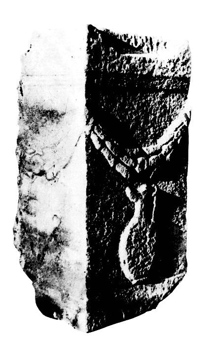 La même année, une prospection a révélé, dans un champ, des murs d'époque romaine et un autel rectangulaire en calcaire blanc, orné d'un bucrane sur la face antérieure, d'une œnochoé sur la face droite et d'un disque creux sur la face gauche (fig. 104). AD 50 (1995) [2000] B'2, p. 447 [K. Préka-Alexandri].