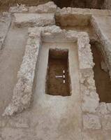 The grave complexes had rectangular plans and their walls were of rows of stoneplinths and the floors were covered either with stones and bonding mortar or with ceramic slabs. The grave pit was opened on the floor.