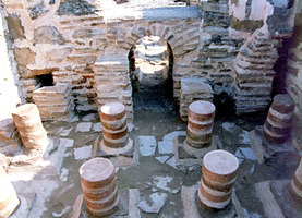 À Thèbes de Phthiotide, la fouille du terrain Iltsopoulou, à environ 60 m de la basilique de Martyrius, a livré les vestiges de thermes à hypocaustes (fig. 1-2). Le sol du frigidarium est en mosaïque à motifs géométriques. Le complexe a du être construit à l’époque romaine, mais il y a des traces de restaurations et réaménagements plus tardifs.