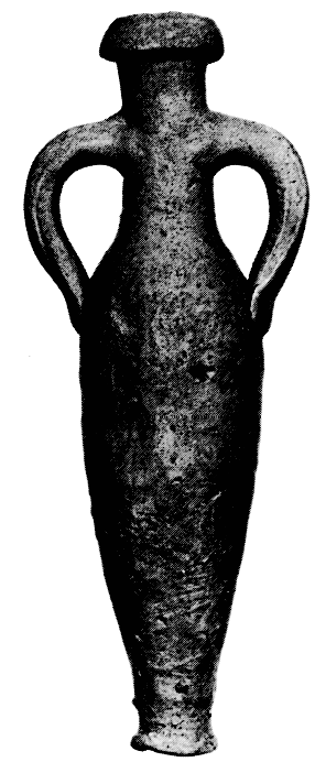 En 1995, une fouille d'urgence dans un terrain situé à 190 m à l'Est de l'acropole d'Halai a mis au jour vingt-six tombes de types divers (la plupart en fosses couvertes de dalles de poros ou de fragments de stèles funéraires remployées) qui appartiennent à la nécropole Est de la cité antique, en usage de la fin du IIIe s. av. J.-C. au Ier s. ap. J.-C. Toutes les tombes renfermaient des offrandes, principalement des vases (lacrymatoires, petits skyphoi sans anses, coupes à omphalos, plats en sigillée, amphores de type macédonien, petite amphore [fig. 1], etc.) et divers objets (figurines en terre cuite, strigiles, objets de parure, vases en verre [fig. 2], lampes, monnaies...).