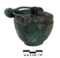 - un encrier de bronze avec anse et réservoir, trouvaille exceptionnelle (MMA 636/59 ; haut. 6,2 cm ; diam. 6,4 cm ; fig. 1) ;