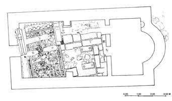 - la phase la plus ancienne correspond à l’abside et au presbyterion d’une basilique protobyzantine (fig. 1). L’abside a été découverte dans un sondage à l’extérieur de l’abside de l’église post-byzantine. Une partie du sol du presbyterion est couverte d’une mosaïque (2,60 x 4,10 m), l’autre de plaques de marbres. La mosaïque est composée d’un cadre rectangulaire constitué de quatre séries de carrés et de cercles représentant des thèmes variés (fig. 2) ; des tombes à fosse ont été aménagées en son centre. La partie dallée de marbre est constituée de matériaux de remploi provenant sans doute d’édifices plus anciens et de stèles inscrites (dont deux décrets). Sur le sol dallé, on distingue la construction de l’autel, la table, constituée de plaques de marbre, posée sur deux murets bas. L’abside n’a pas été explorée. Une partie du cloisonnement du presbyterion est visible avec les cavités pour la mise en place des parapets et des colonnettes.