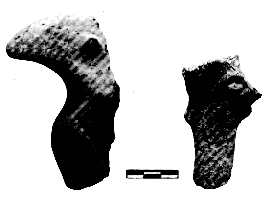 Sur la toumba de Polyplatanos (à 1,7 km au Nord-Ouest du village), où avait été repéré en 1994 un site néolithique étendu (v. BCH 119 [1995] Chron., p. 939), le Service archéologique a effectué, en 1997 et 1998, une série de sondages, mettant au jour trois horizons d'habitation NR. Le plus récent est représenté par un grand bâtiment en torchis qui doit mesurer environ 112 m2 ; sur son sol en terre calcaire blanchâtre, qui présente trois états successifs, se trouvaient un foyer ovale, des vases de stockage et un lot de poids de métier et de pesons de fuseau. Le mobilier comprend de la céramique diminienne (fig. 1), des figurines anthropomorphes (fig. 2) et zoomorphes et de nombreuses pièces d'outillage lithique poli.
