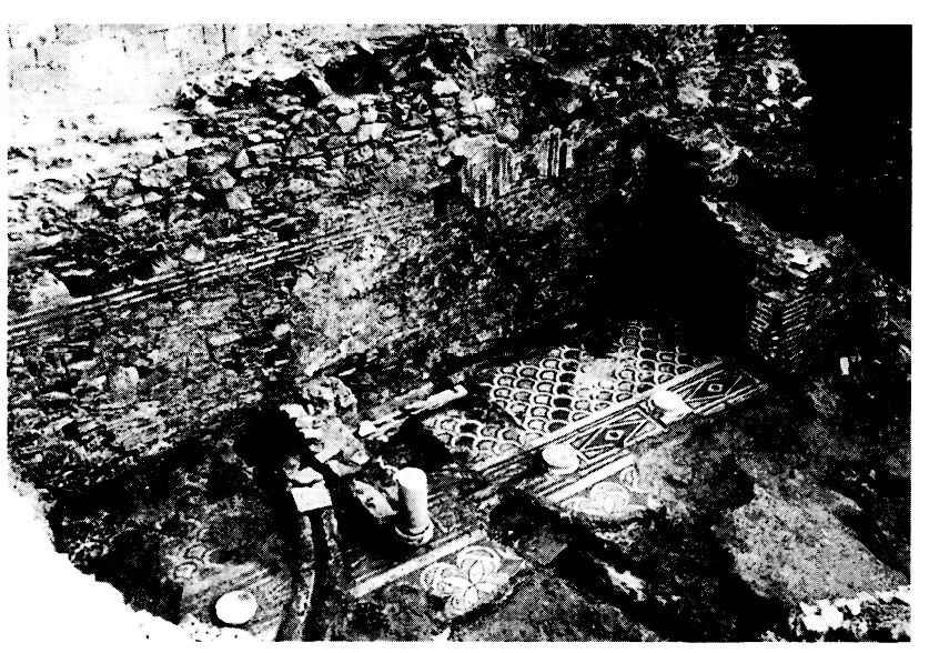 2) Habitations. — Les vestiges d'une nouvelle villa du Ve s. ap. J.-C, notamment son portique Est et une partie de l'atrium, ont été dégagés dans la petite rue Glafkou (entre les rues Olympiados et Antipatrou, v. BCH 124 [2000] Chron., p. 927) ; le sol du portique (9 x 2,20 m) était pavé de mosaïque, son mur de fond décoré de peintures (fig. 153). Après l'abandon de la villa, au début de la période mésobyzantine, trois latrines furent construites sur ses ruines ; tout indique qu'elles étaient destinées à un groupe dépassant largement le cadre d'une famille, sans doute l'un des complexes monastiques déjà connus dans la région (v. ibid.). ΑΕΜΘ 13 (1999) [2001], p. 249-258 [N. Karydas].