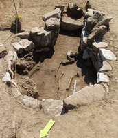 Près du lieu-dit Chomatokastro, à Mataranga, on a découvert les vestiges d’une tombe à chambre protogéométrique de petites dimensions (2 m de diamètre intérieur), conservée sur une hauteur de 0,86 m (fig. 1). L’inhumation principale se trouvait en position allongée, au centre de la chambre, et plusieurs sépultures secondaires (ossements rassemblés) étaient disposées autour : quatre crânes ont été retrouvés. Peu de matériel était présent dans la tombe, à l’exception d’une cruche protogéométrique, une perle en pierre et une autre dorée, et un bijou en bronze : tout indique que la tombe a dû être pillée.