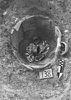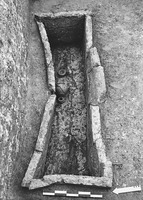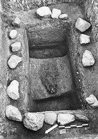 La fouille du terrain Chrysochoou à Thermi, qui a débuté en 1999, a mis au jour une nécropole de 125 tombes (fig. 1). La majorité (85 tombes) appartient au type de la fosse couverte d’une dalle de schiste ou de poros. Quelques-unes sont délimitées par un enclos de gros galets (fig. 2). On compte également 19 cistes, 7 sarcophages en poros, une tombe à tuiles, un enchytrisme et 7 urnes cinéraires (une en bronze et les autres en terre cuite) (fig. 3-4).