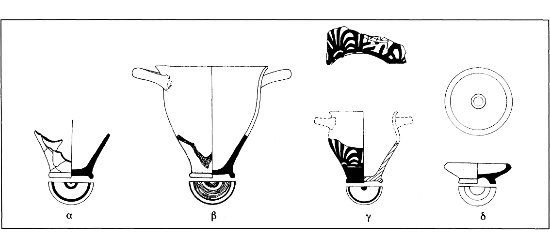 — à 200 m à l'Ouest de l'église du Saint-Sauveur (terrain Baboura), une couche perturbée jouxtant un mur (de soutènement ?) a livré une abondante céramique, dont des amphores du IVe s. av. J.-C, des vases sans doute attiques (fig. 177) et quelques tessons de céramique non tournée datant sans doute de la même époque ;
