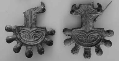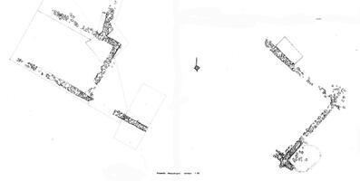 A plot of land was investigated measuring 18 acres (Fig. 1). Finds that came to light included a few architectural remains, defining a few rectangular spaces (Fig. 2). Most finds came from the late Roman and early Byzantine periods. Pottery included coarse sherds of red-brown clay, parts of jars, tiles, and a few other small vessels. A ring-shaped vessel support of the 4th/5th century AD was found (Fig. 3), a tile with an embossed seal, and two bronze brooches of the Byzantine period, 7th century AD (Fig. 4).
