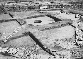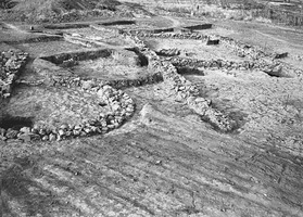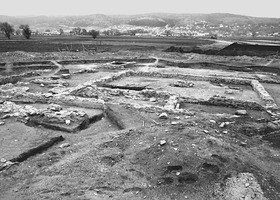 - Ferme B. – Elle a été dégagée au Nord-Est de la ferme A : ont été mis au jour les vestiges de deux bâtiments, dont les murs sont conservés en fondation (fig. 2). La charpente était couverte de tuiles de type laconien. Le premier bâtiment couvrait une surface de 460 m2, le second une surface de 68,5 m2. Une cour rectangulaire au centre du premier bâtiment est délimitée à l’Est et à l’Ouest par deux pièces allongées. Des vestiges d’enduit peint dans la pièce Ouest indiquent qu’il s’agit du lieu de séjour du propriétaire. De nombreux pesons en terre cuite attestent une activité de tissage. La céramique recueillie fixe l’occupation de la ferme entre le Ier s. av. J.-C. et le Ier s. apr. J.-C