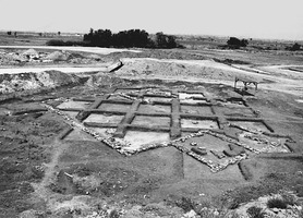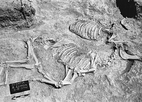 - Ferme Δ. – Deux bâtiments ont été dégagés au Sud-Ouest des trois autres fermes (fig. 4). Il s’agit des bâtiments annexes d’une ferme dont la partie centrale n’a pas été découverte : un triclinium, d’une superficie de 207,50 m2, constitué d’une salle principale et de deux annexes, et un bâtiment allongé à deux pièces (superficie 150 m2). La découverte de la sépulture de deux chevaux (fig. 5) au Sud-Est du triclinium et d’une autre sépulture de cheval dans l’édifice allongé permet son identification avec l’écurie. L’analyse archéozoologique des os a permis d’identifier deux chevaux masculins de trait et un cheval de guerre. – Le matériel issu de la fouille, parmi lequel on signale des lampes de terre cuite des IIIe-IVe s. apr. J.-C. et des fragments d’une figurine de terre cuite représentant la Mère des Dieux (fig. 6), place l’occupation de la ferme entre le milieu du IIIe s. et la fin du IVe s. apr. J.-C.