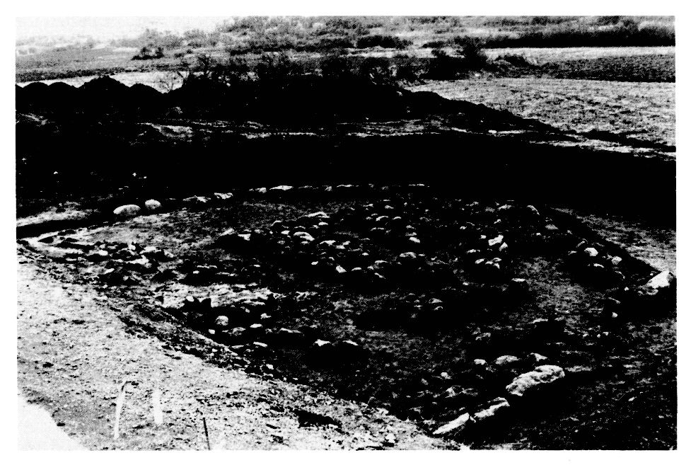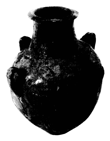 En 1997, une fouille d'urgence au lieu-dit Verpen, au Sud-Est de l'agglomération, a mis au jour — outre quelques vestiges hellénistiques et tardo-romains attendus depuis la prospection de 1992 (v. BCH 122 [1998] Chron., p. 853 [Chronique n.12609]) —, un tumulus d'un type nouveau dans la région (fig. 1), sans chambre centrale ni dromos. Il mesurait 15 m de diamètre, était entouré d'un péribole de moellons et renfermait des amas de pierres ; parmi ceux-ci on a recueilli les fragments de quatre vases, dont une amphore à quatre anses (fig. 2) d'un type hérité de l'Âge du Bronze et qui perdure à l'Âge du Fer, et un petit couteau en fer.