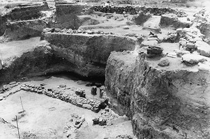 - les pièces 1 et 2 ont un sol dallé : la pièce 2 en a conservé deux niveaux, que sépare une couche de destruction riche en céramique et en briques brûlées, indiquant que l’élévation de la phase précédente (phase 2) était en brique crue et que l’édifice avait été détruit par un incendie. Par ailleurs, le mur de soutènement Nord, au niveau de la pièce 2, est fondé sur cette couche de destruction ; sa construction est donc liée à la phase suivante (phase 1). La couche de destruction est également présente dans les autres pièces.