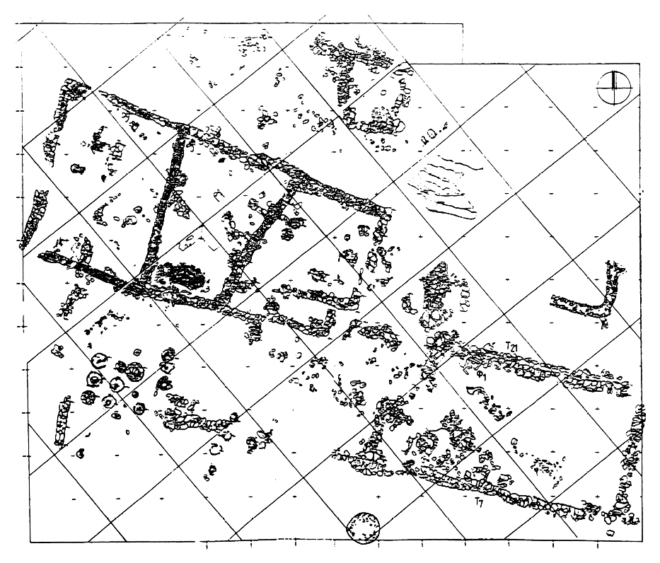 Habitat. — Sur une « table » qui s'étend au Nord de la toumba de l'Âge du Bronze, a été dégagé un grand bâtiment rectangulaire de l'Âge du Fer (17,80 x 10,30-9,40 m) présentant deux états. Dans le plus récent, il comportait trois pièces précédées par un auvent à l'Est (fig. 1). Au Sud du bâtiment, la fouille a mis au jour un ensemble de dix-sept pithoi in situ dans un local dont les murs ont presque entièrement disparu ; au Sud-Est, une cour renfermant divers équipements pour la préparation de la nourriture, dont un four rectangulaire. D'après la céramique, ce petit établissement, proche de l'habitat déjà repéré sur la « table » de Naresh, fut occupé entre la fin du IXe et le VIIe s. av. J.-C.