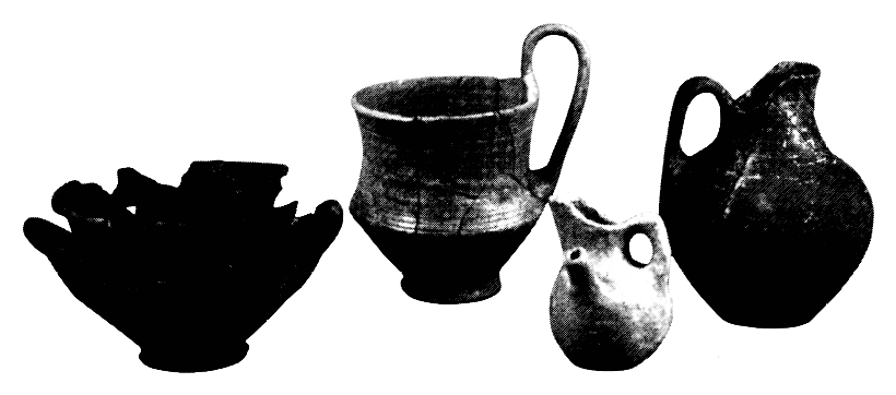 Nécropole. — Dans la plaine, entre cet établissement et la « table » de Naresh, s'étend la nécropole de l'Âge du Fer (mentionnée dans BCH 123 [1999] Chron., p. 761), impressionnante à la fois par ses dimensions, la densité des tombes et la netteté de ses limites (fig. 2). On y a dégagé en tout 1 350 tombes (fosses et cistes), à inhumation pour la plupart, dont environ 40 % contenaient du mobilier funéraire : vases (fig. 3), bijoux en fer et en bronze, outils. Dans le secteur Sud de la nécropole, qui est le plus récent, apparaissent quelques périboles funéraires.