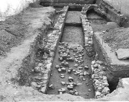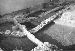 Both walls are hastily made by small crude stones and soil, and are only partially preserved. The area defined by the W wall is divided in two parts, with a wall vertically placed towards the arch. This area was not completely unearthed due to the fact that its largest part is located under a store nearby. The area between the two elongated walls was covered by a layer of soil, building material and pottery, potentially serving as a road leading to the beach. The deposits under the sub-foundations of the wall contained pottery of the Early and Middle Roman period. An Early Roman wall (SW-NE) was detected right to the east of the arch; the purpose of the arch is not certain, but it might have been part of an outdoor space near the road. The width of the cistern at the outdoor space in the SW corner of the plot (Fig. 4) was discovered intact, while the S part expands to another plot. During a later building phase, the cistern was abandoned.
