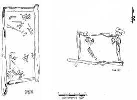 Two cist graves were found, made of sandstone slabs placed vertically, and dating to the protogeometric and geometric period (Fig. 1). The first contained one adult, seven crushed ceramic vessels, three highly oxidised metal objects; and the second a child burial with two crushed ceramic vessels.