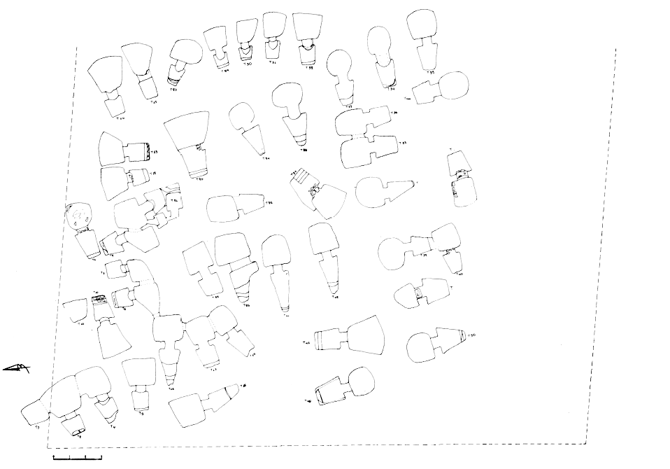 En 1996, on a poursuivi la fouille du terrain Papakyriakou, mettant au jour une cinquantaine de nouvelles tombes HA/CA II (fig. 187) (v. BCH 124 [2000] Chron., p. 964). Elles appartiennent toutes au type déjà connu (tombes creusées dans le rocher avec dromos, entrée fermée par des pierres ou par une plaque et chambre pavée de galets ou de coquillages). Parmi leur riche mobilier on mentionne un grand nombre de « poêles à frire » (fig. 188) – appuyées contre les parois ou posées à plat sur le sol et contenant des ossements ou des outils en obsidienne –, de vases en marbre et d'objets en bronze (bijoux, spatules) ; les cruches, particulièrement nombreuses, se trouvaient dans les tombes les plus richement dotées, en général avec des « poêles à frire », des objets en bronze et des boîtes à couleurs en os. On signale aussi la découverte d'une figurine en marbre (fig. 189) et de deux bagues en or (fig. 190) qui ont des parallèles à Lemnos (Poliochni). La présence d'ossements d'animaux suggère la pratique de repas funéraires au-dessus ou autour des tombes. AD 51 (1996) [2001] Β'1, p. 289-300 [E. Sapouna-Sakellaraki].