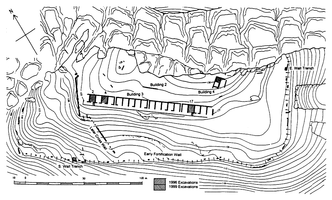 Dans le bâtiment 3, on a achevé l'exploration de la pièce XVII, à moitié fouillée en 1996 (v. ibid.). Le niveau de son sol était indiqué par la présence de nombreux tessons appartenant surtout à des vases à boire ; on note l'absence d'aménagements fixes et d'objets en métal.