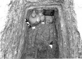 Fifteen trenches (3×2.50 m.) covering the entirety of the unexcavated W area, were opened in total. Twenty eight Hellenistic graves that were part of the cemetery were uncovered (Fig. 3). Each grave contained one individual in extended position, while in a few cases double burials were detected. Most of the burials contained grave offerings (Fig. 4,5), with a jug placed next to the head of the deceased, and the rest of the vessels being laid out in the rest of the grave. In grave 27, the buried individual had a disproportionate skull in comparison to the rest of the skeleton and was not accompanied by offerings, while grave 11 contained the burial of a female with a large amount of grave goods.