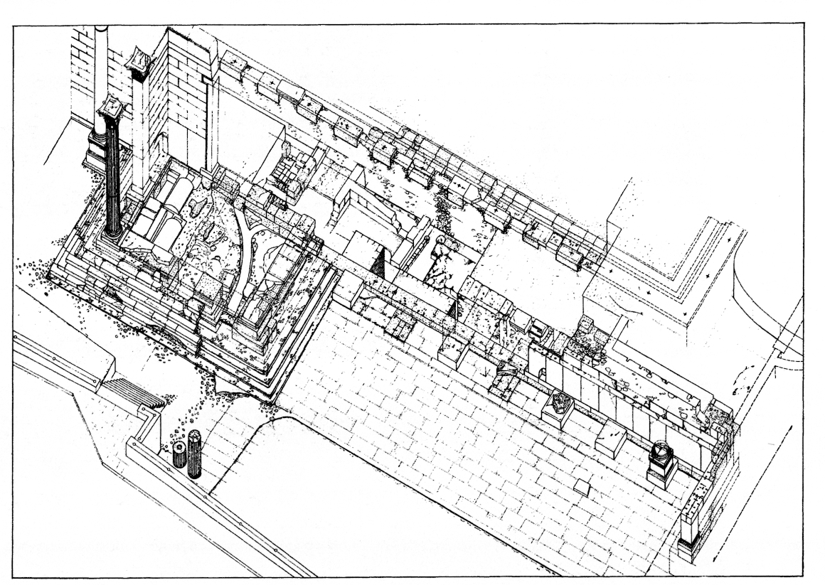 Rempart tardo-romain. — À l'angle Sud-Ouest du terrain, on a dégagé un segment du parement Nord du rempart tardo-romain, dont l'appareil en blocs remployés (orthostates en marbre gris de l'Hymette provenant sans doute des boutiques de l'agora romaine, blocs en marbre et en poros, chapiteaux), récupérés de monuments visiblement détruits lors de l'invasion des Hérules en 267, tentait d'imiter celui du monument d'Hadrien.