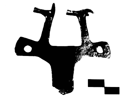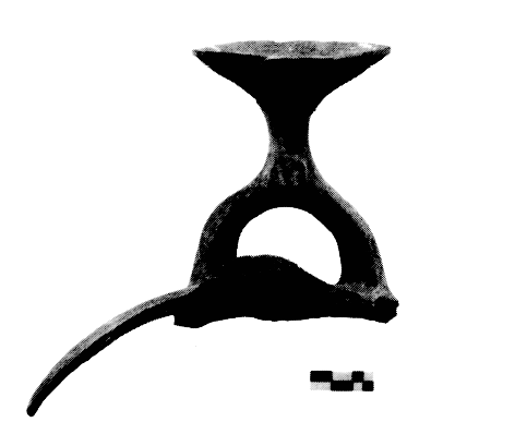 Fouilles de l'Université de Thessalonique. — L'exploration du bâtiment géométrique en brique crue découvert sur la « table » inférieure (v. BCH 122 [1998] Chron., p. 864 ; Chronique n.11833) a été poursuivie en 1997. Les nouveaux sondages ont confirmé l'existence de deux phases architecturales (milieu et fin du VIIIe s. av. J.-C.) et apporté des informations complémentaires sur l'étendue et la fonction du bâtiment, qui comportait apparemment plusieurs pièces. À la phase ancienne correspondent des vestiges d'installations sans doute artisanales, à la phase récente ceux d'un four domestique. Il faut surtout noter la découverte de deux objets « cultuels » : un vase de fabrication locale dont les anses sont pourvues d'un appendice surmonté par un grand disque (fig. 1) et une hache en bronze ornée de deux têtes d'animaux plastiques (taureau et chèvre) (fig. 2), qui devaient être posés sur une banquette (?) en brique. La présence de céramique locale et eubéenne témoigne des relations de ce site avec l'Eubée, dont il était peut-être un emporium.
