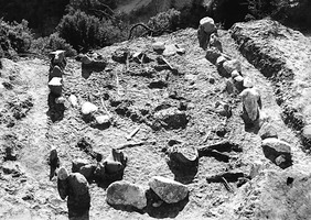 Trois enclos funéraires de l’Âge du Bronze Récent ont été découverts au lieu-dit Kokkina Vrachia, près de Phaia Petra (fig. 1-2). Ils sont constitués de pierres posées sur le sol et délimitant l’espace où les défunts sont inhumés ou incinérés. Quelques offrandes métalliques (bijoux en bronze et armes), des vases en terre cuite (amphores à quatre anses et coupes à quatre anses avec un pied élevé et conique et décor incisé et appliqué* caractéristique de l'Âge du Bronze Récent en Macédoine centrale et orientale) et des ossements animaux ont été recueillis.