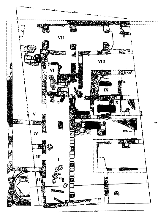 La partie la plus ancienne du complexe (fig. 3, pièces I-VI) était occupée par un portique avec colonnade (I) sur laquelle s'ouvraient quatre pièces. L'une d'elles (II), en abside, abrite une mosaïque à décor végétal et géométrique ; deux autres, à l'Ouest de la stoa, comportent un escalier. Au second état — qui suivit la destruction, causée par le séisme de 365 ap. J.-C. — appartient la pièce VII, en forme de portique, qui pourrait être une étable, ainsi que les pièces IX et X, situées plus au Nord et bordées par un couloir coudé. Le reste du terrain était occupé par une sorte d'atrium, qui, si l'on en juge par la présence de déchets de sidérurgie, dut servir d'atelier métallurgique à l'époque romaine tardive.