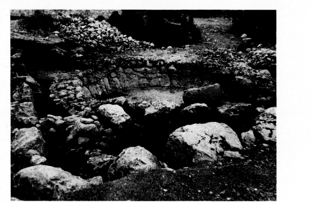 — un petit pont qui franchissait le lit d'un torrent aujourd'hui asséché ; il était construit en gros moellons disposés en encorbellement et la chaussée qui le recouvrait a pu être suivie sur une bonne distance ; quelques murs en pierres sèches découverts dans les environs appartenaient sans doute à des habitations, d'autres, dans le lit du torrent, devaient servir à en ralentir le cours ;