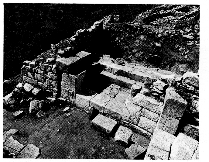 La tour A appartient au dernier état. La tour B, dans laquelle on a trouvé treize boulets de catapulte en pierre associés à une couche de destruction datée de 148 av. J.-C, fut en usage du IVe s. au IIe s. av. J.-C. Dans le secteur Ouest, la fouille a mis au jour des pièces d'habitation et de stockage avec pithoi in situ, qui appartiennent au premier état, de même qu'une poterne dans le rempart, des portes jumelles (fig. 2) et la porte « de Priape », qui doit son nom au relief découvert dans cette zone (fig. 3) ; en face de la porte de la tour Γ, un mur de soutènement supportant un bâtiment dans lequel on a trouvé des fragments d'enduits peints. On signale aussi la découverte d'un couloir qui, partant de la porte Nord-Est et se dirigeant vers la porte Sud-Ouest, sépare en deux l'intérieur de la forteresse. Dans tous les sondages, les couches profondes recelaient de la céramique du début de l'Âge du Fer, ce qui suggère l'existence d'un habitat de cette période sur la colline.