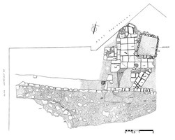 La fouille du terrain S. Kourouli à Mytilène a livré des vestiges de thermes romains comportant des réaménagements postbyzantins (fig. 1-2). Les murs délimitant la pièce souterraine (2,42 x 2,40 m) sont construits en blocs de taille liés avec du mortier. Un mur puissant de 10 m de long et de 2,50 m de large a été dégagé ; il appartient à la deuxième phase de construction de l’édifice. L’entrée de la pièce à hypocaustes a été barrée par un mur et le sol du caldarium en carreaux de terre cuite a été détruit par la construction d’une citerne.