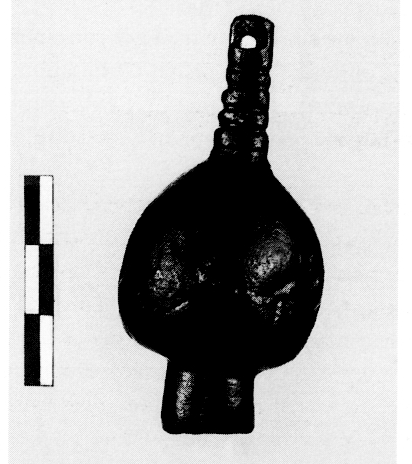 Toujours dans la même région, on signale la découverte d'une nouvelle nécropole, dont les vingt-neuf tombes à tuiles fouillées s'échelonnent entre l'époque archaïque et l'époque romaine. Seule pièce notable de leur maigre mobilier : un pendentif archaïque en bronze en forme de grenade, type fréquent en Thessalie (fig. 1).
