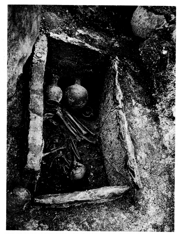 En 1991, des fouilles clandestines ont amené la découverte de deux nouvelles tombes à chambre mycéniennes au lieu-dit Skamna (v. BCH 120 [1996] Chron., p. 1202). On a d'autre part découvert fortuitement, à 2 km au Sud-Ouest de Modi, trois pithoi funéraires d'époque archaïque. L'année suivante, huit tombes de la fin du Protogéométrique (trois pithoi et cinq cistes) ont été fouillées au lieu-dit Aghios Athanassios ; l'une des cistes contenait trois vases, deux boucles d'oreille en or, quatre anneaux en bronze passés aux doigts du défunt et trois épingles en fer à la hauteur de ses épaules (fig. 1).